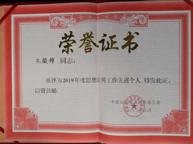 朱駿鋒同志被評為“2019年度思想宣傳工作先進個人”