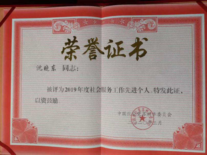沈曉東同志被評為“2019年度社會服務先進工作個人”